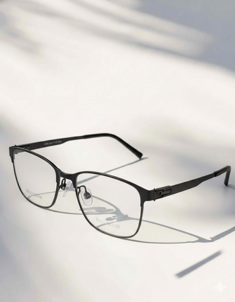 แสงที่มีความคมชัดสูงใช้เงาเพื่อเน้นเส้นขอบของกรอบแว่น